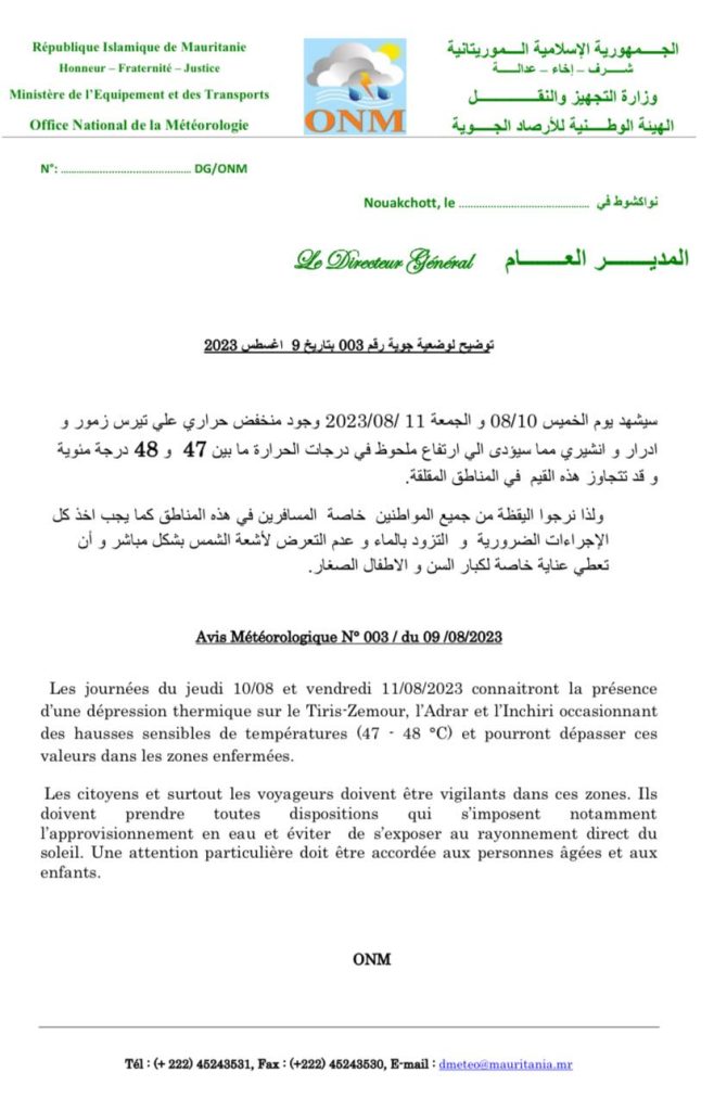 وقالت الهيئة في بيان، إن ولايات تيرس زمور وآدرار وإينشيري، ستشهد ارتفاعا في درجات الحرارة ما بين 47 إلى 48 درجة مئوية، يومي الخميس والجمعة 10 و11 أغسطس الجاري.