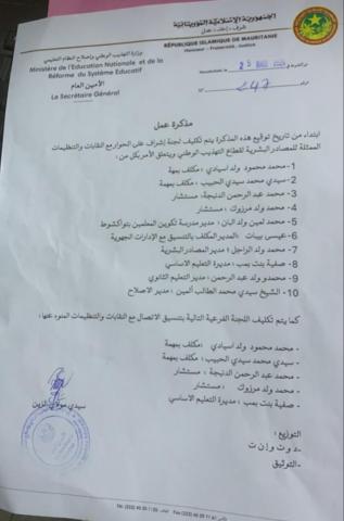 Follow me وزارة التهذيب تشكل لجنة من كبار موظفيها للحوار مع النقابات (وثيقة) وقع الأمين العام لوزارة التهذيب سيدي ولد…